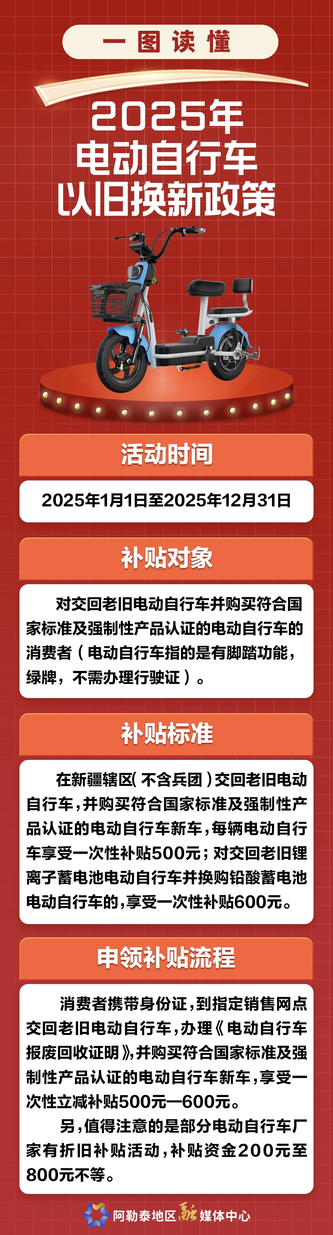 在新疆辖区(不含兵团)交回老旧电动自行车,并购买符合国家标准及强制性产品认证的电动自行车新车,每辆电动自行车享受一次性补贴500元;对交回老旧锂离子蓄电池电动自行车并换购铅酸蓄电池电动自行车的,享受一次性补贴600元。
