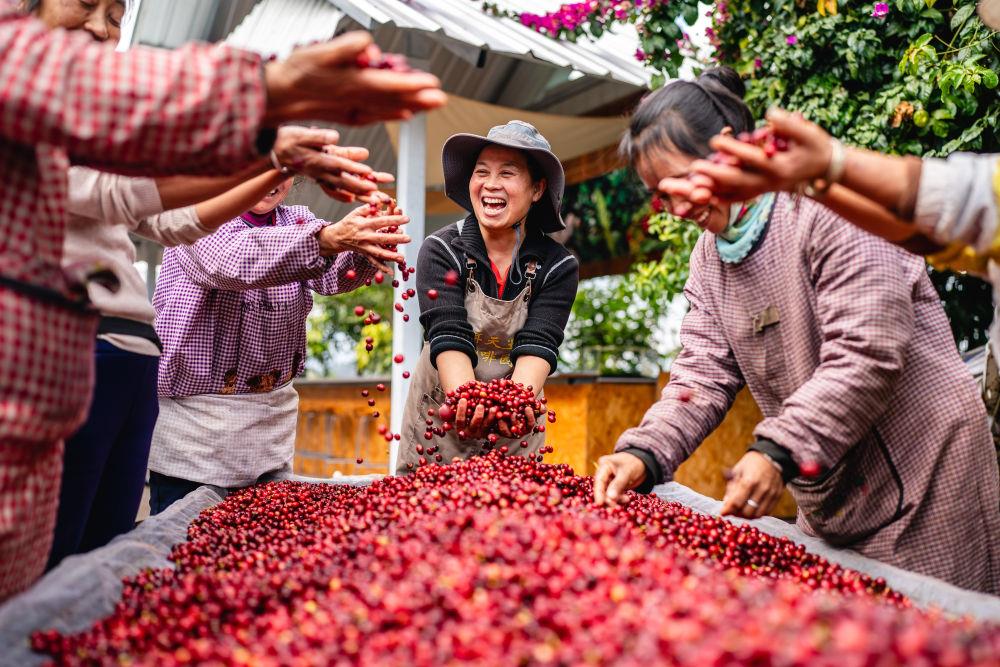 △2025年1月8日,在云南普洱思茅区一咖啡庄园,工作人员庆祝咖啡丰收。