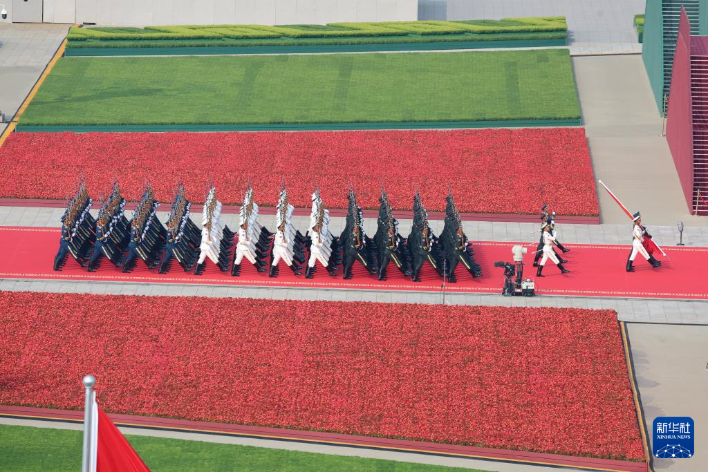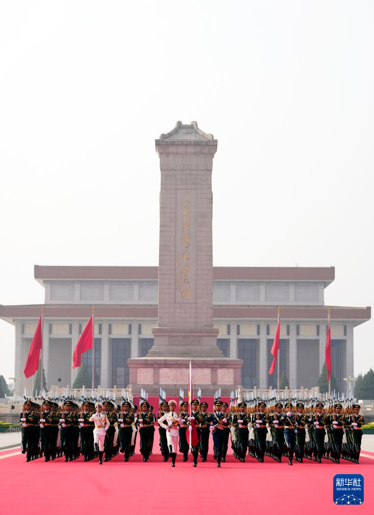 9月3日,纪念中国人民抗日战争暨世界反法西斯战争胜利80周年大会在北京隆重举行。这是国旗护卫队从人民英雄纪念碑基座出发,走向旗杆基座。新华社记者 杜宇 摄