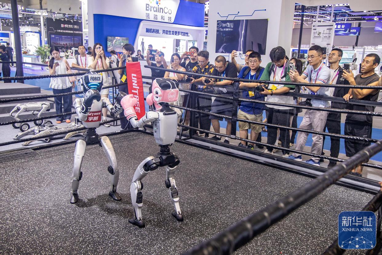 这是9月4日在2025世界智能产业博览会宇树科技展厅拍摄的机器人拳击赛现场。