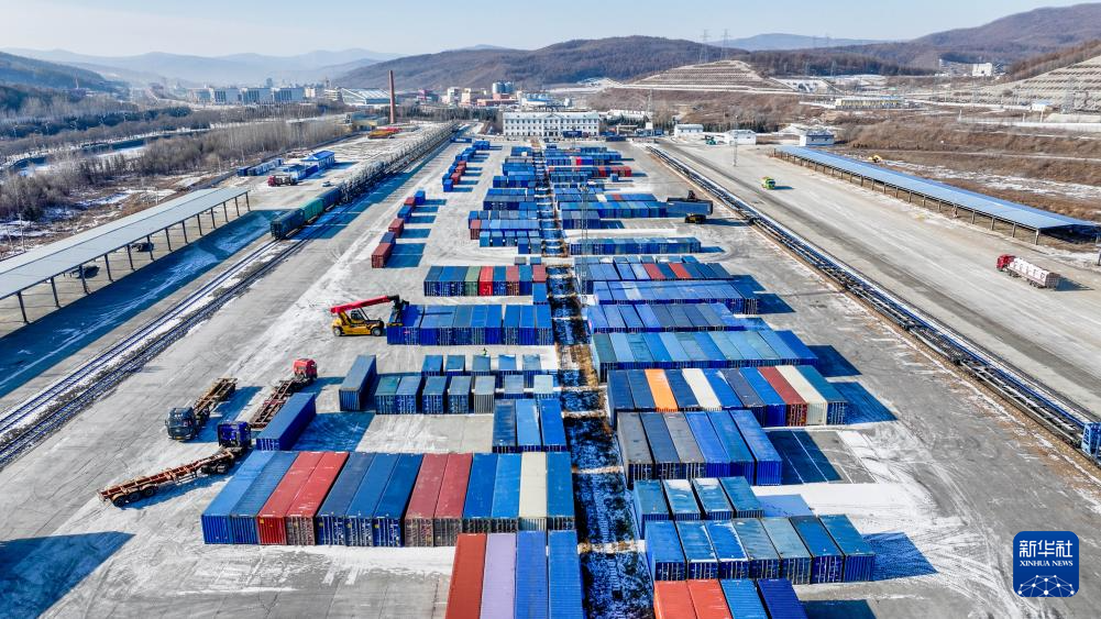 12月10日,中国铁路哈尔滨局集团有限公司绥芬河站三货区正面吊在进行倒箱作业(无人机照片)。新华社发(曲艺伟摄)