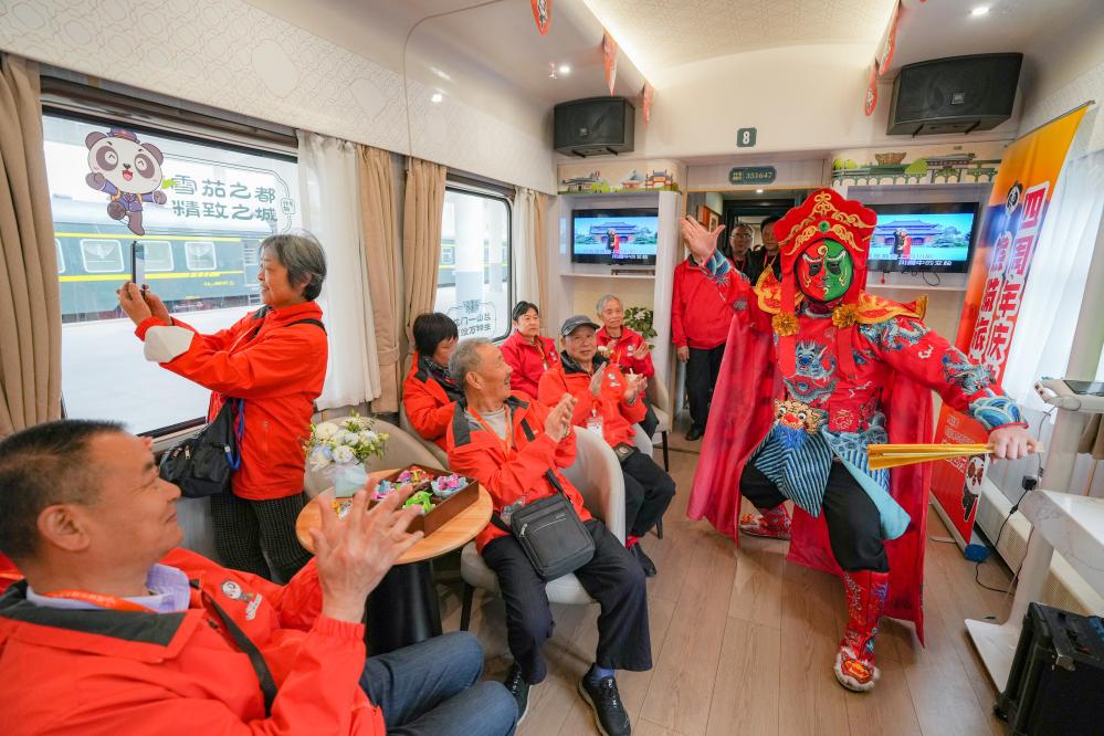 2025年3月28日,在Y471次“熊猫专列·什邡号”列车上,旅客观看川剧变脸表演。这是一辆60岁以上的游客占比达到68%的“银发专列”。新华社记者 王曦 摄