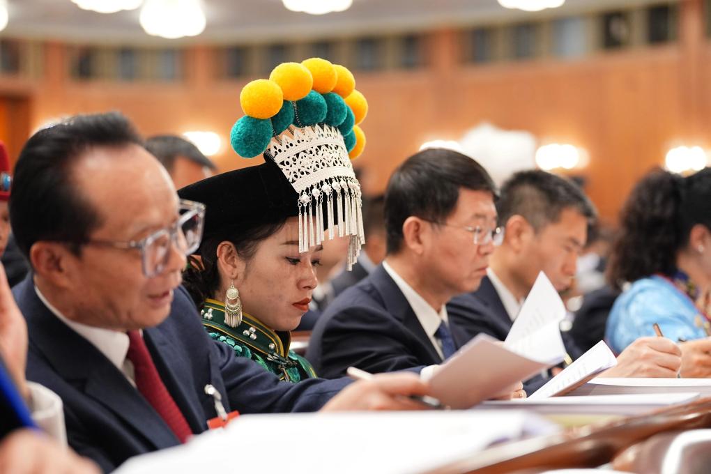 3月5日,郭红静代表在十四届全国人大四次会议开幕会上听会。新华社记者 邢广利 摄