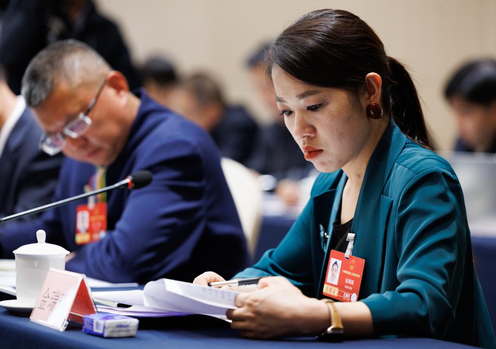 3月6日,金瑞瑞代表在驻地参加分组审议。新华社记者 金立旺 摄