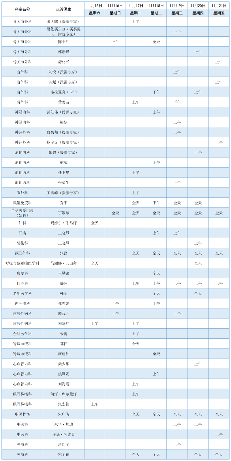 阿勒泰地区人民医院11月15日至11月21日专家门诊坐诊表