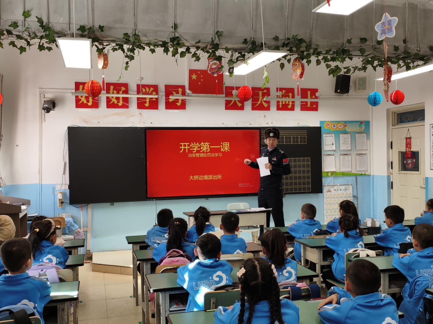 冲乎尔边境派出所组织民警走进辖区学校,为全体教师和学生精心准备并讲授了内容丰富的“开学第一课” 通讯员 史泽雄摄