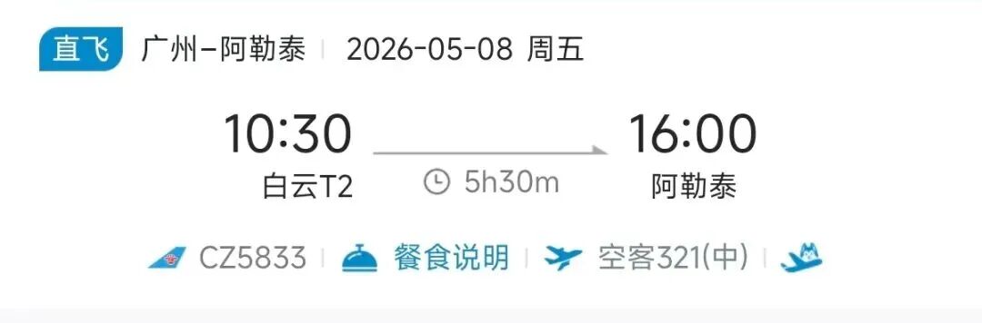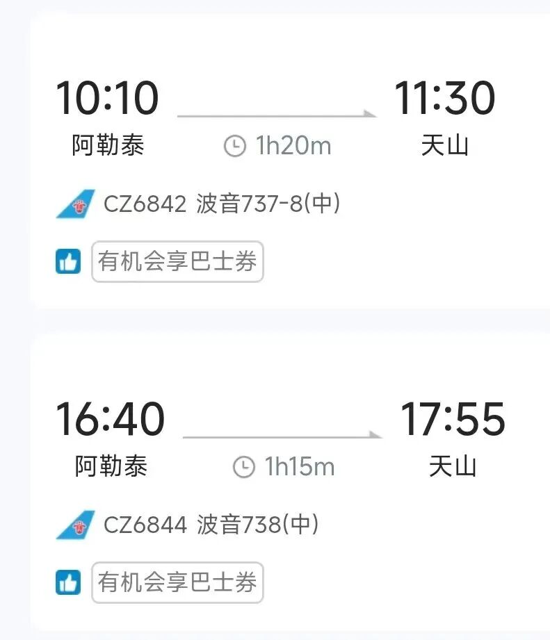 去程航班10:50从阿勒泰起飞