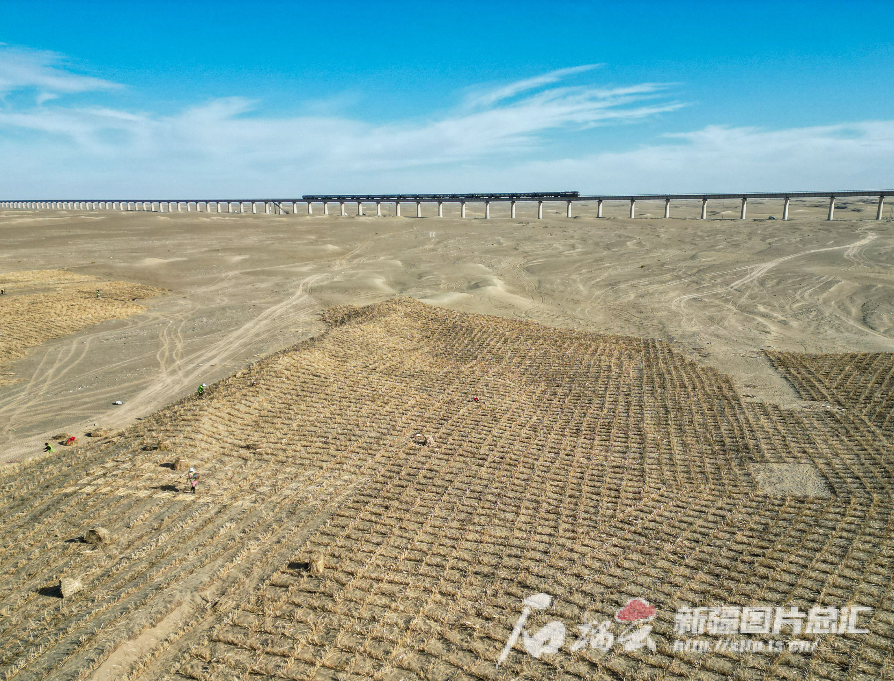 草方格紧紧锁住沙漠,守护着穿越沙漠的和若铁路。 记者 许晓龙摄