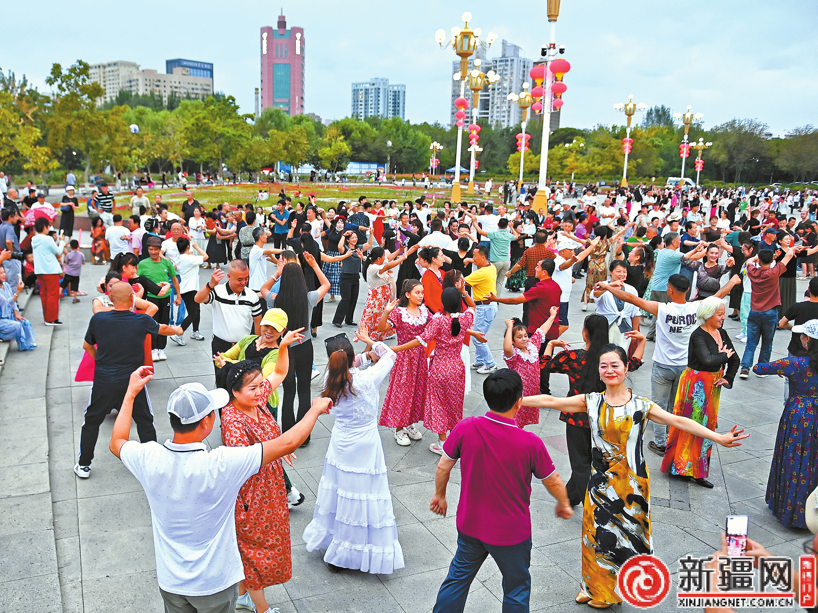 各族群众在南湖市民广场伴随着音乐的节奏跳起欢快的舞蹈。(乌鲁木齐晚报资料图片)