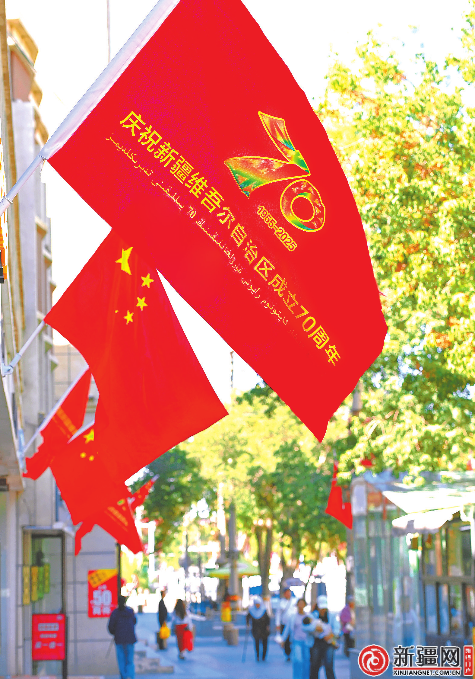 米东区古牧地中路沿街商铺门前印有新疆维吾尔自治区成立70周年庆祝活动标识的道旗随风飘扬。(记者陈岩摄)