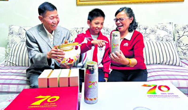 9月26日,兵团第六师五家渠市军垦路街道军垦北路社区居民杨生瑞(左)一家对中央代表团赠送的礼物爱不释手。 天山网-新疆日报记者汤永 摄