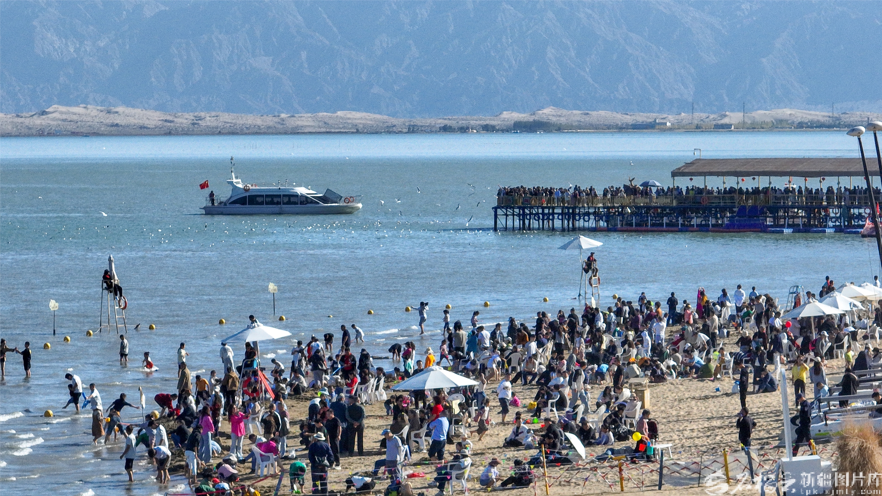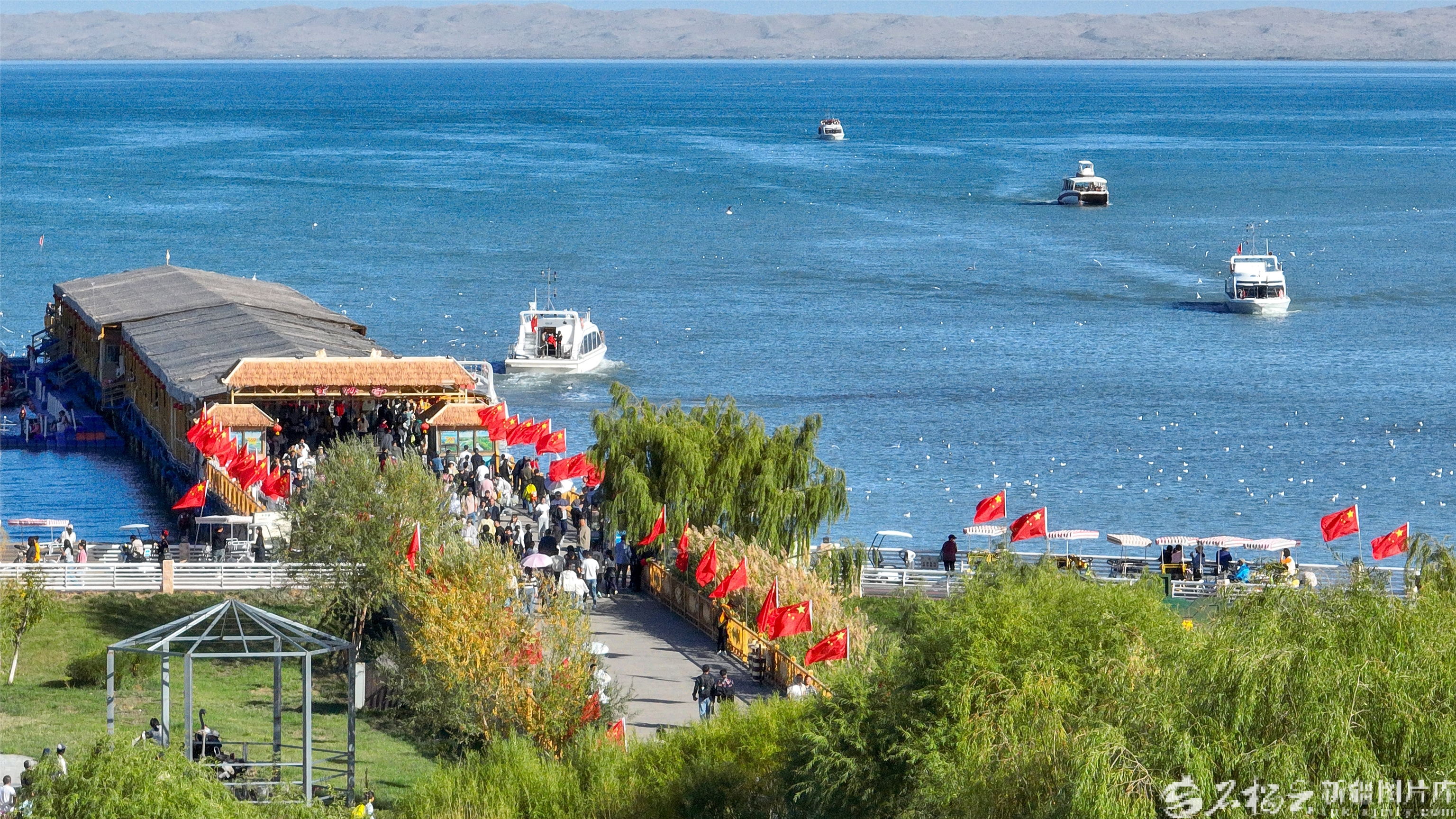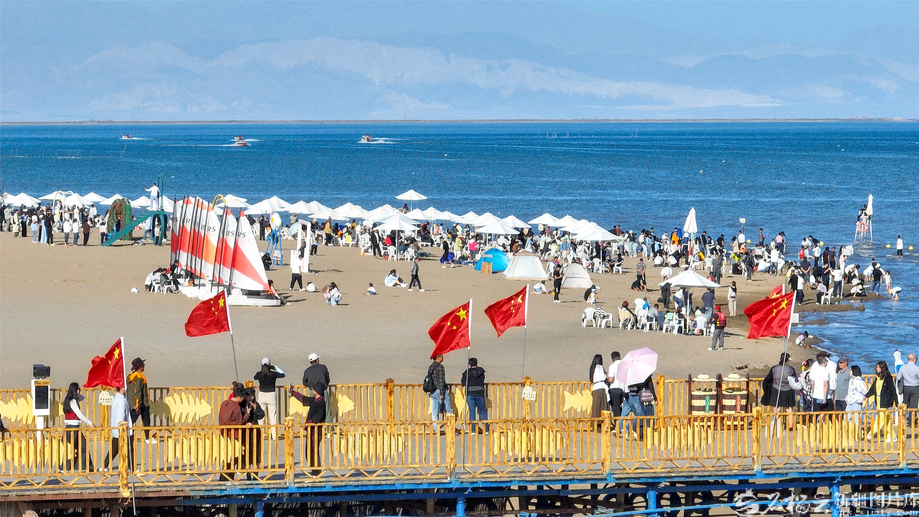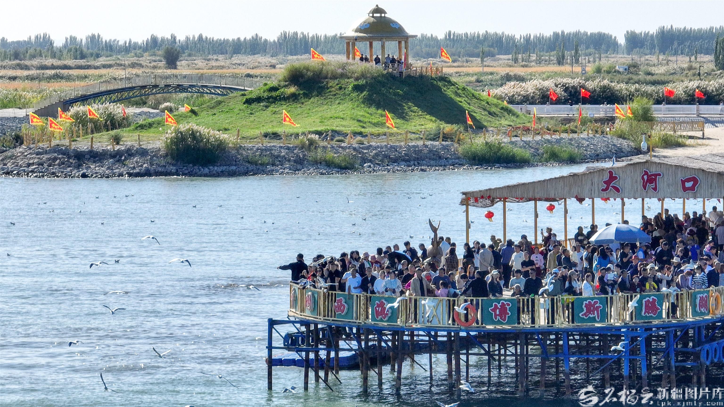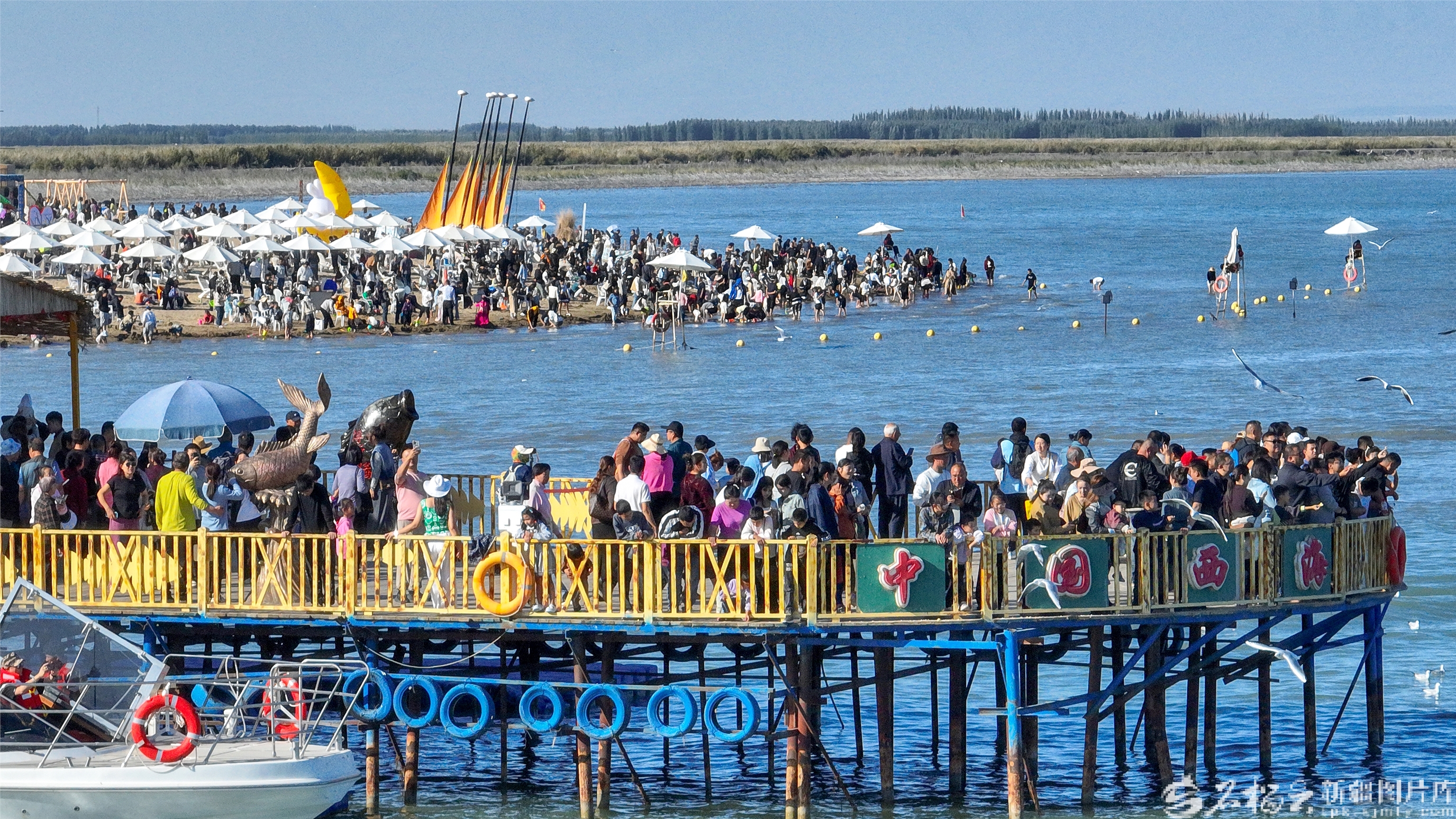 10月4日,游客在博湖县境内的博斯腾湖大河口景区体验娱乐项目。国庆中秋假期,博湖县推出“文旅+生态”“文旅+民俗”系列活动,吸引各地游客纷至沓来。年磊摄