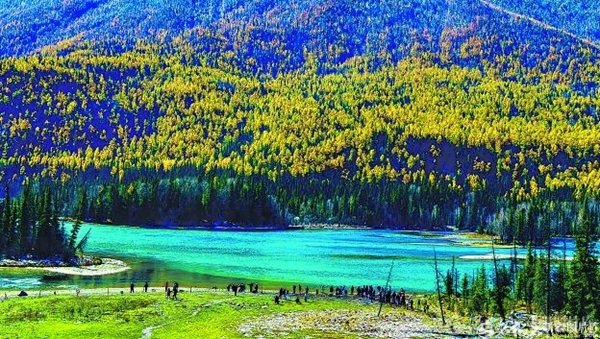 10月6日,游客在卧龙湾游玩拍照。国庆中秋假期,喀纳斯景区秋色迷人,吸引很多游客到此打卡。 张宇翔摄