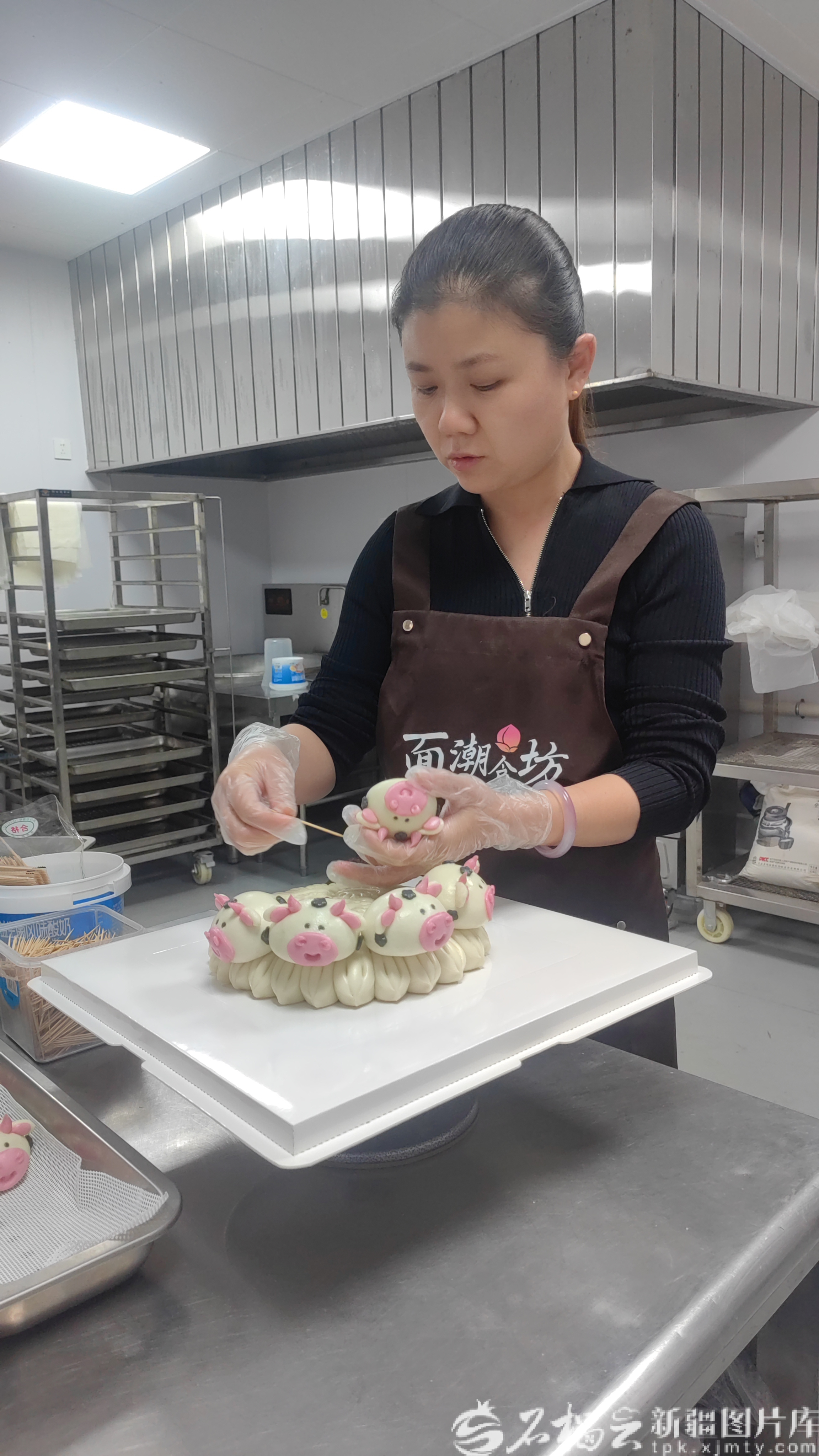 近日,在乌鲁木齐市米东区三道坝镇三道坝村面潮食坊,蒋爱华在制作花饽饽。蒋爱华供图