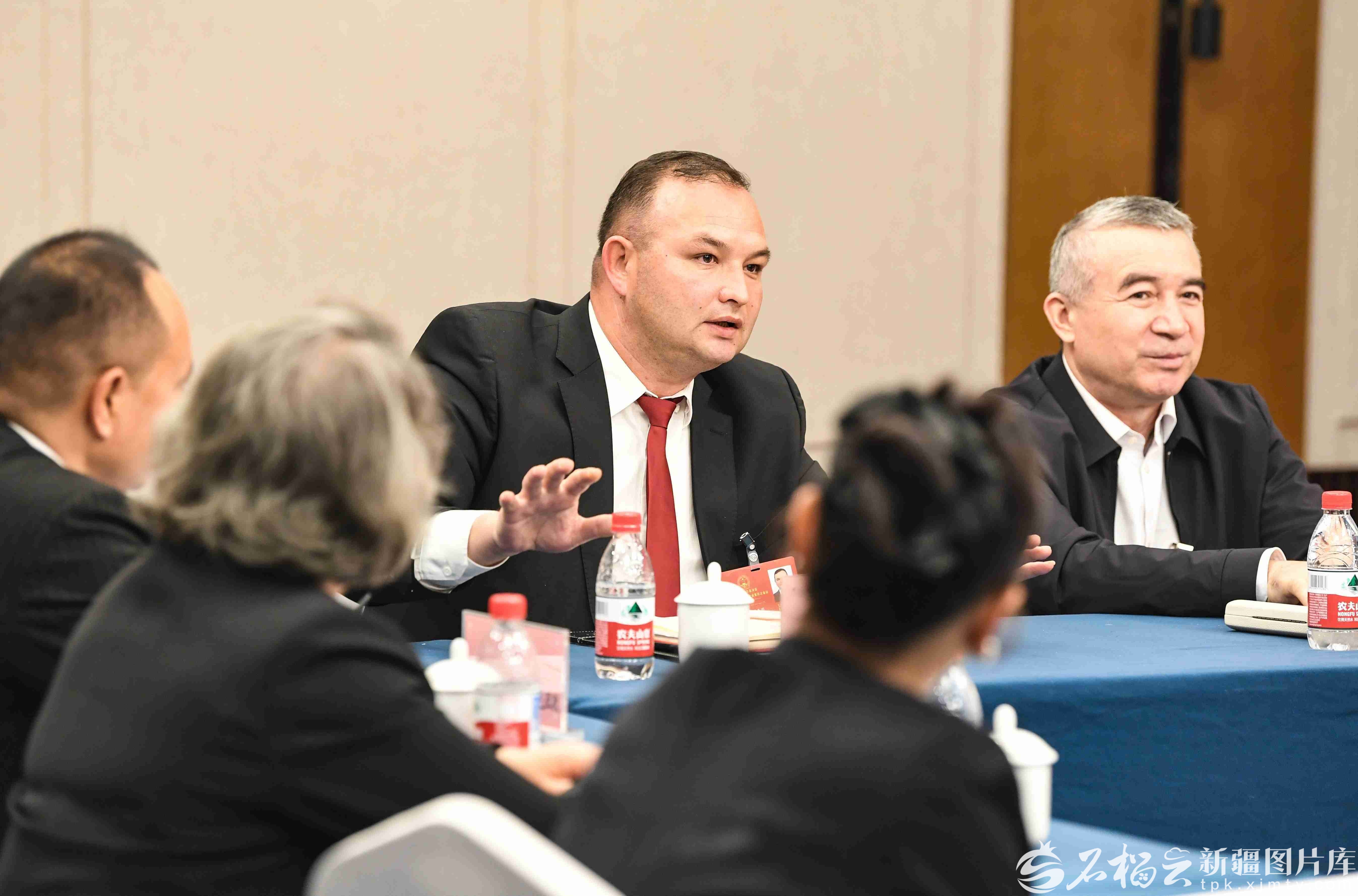 1月28日,排尔哈提·艾合麦提尼亚孜代表(右一)在参加和田地区代表团审议时,就坚持协调发展,促进乡村振兴等内容发言。天山网-新疆日报记者 汤永摄
